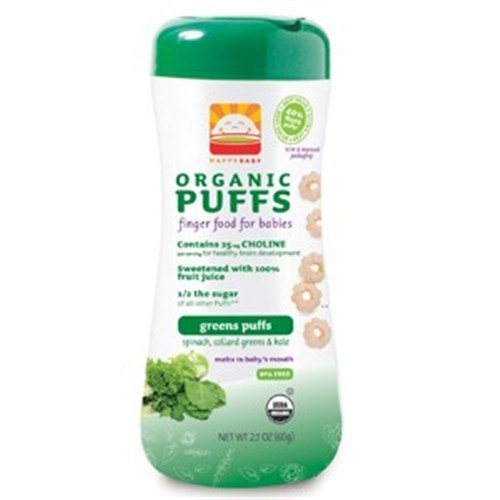 ORGANIC GREENS PUFFS : finger food for babies | melt in baby's mouth ORGANIC PUFFS are different than other first foods on the market: ? 1/2 the sugar of the leading brands (Gerber and Beech-Nut each contain 1g sugar) ? Great source of iron, vitamin D, calcium, and B Vitamins ? Made with whole grains THE HAPPYBABY DIFFERENCE ? Always organic: Never any artificial flavorings. Sweetened with 100% fruit juice. Our puffs are made with organic whole grains, fruits and vegetables. ? Fortified with vitamins & minerals: Enriched with 40 IUs (10%) of your baby's recommended daily value of Vitamin D. According to the American Academy of Pediatrics, many infants are deficient in this vital nutrient. ? Recommended by: Dr. Bob Sears, renowned pediatrician and author of The Baby Book. ? Better Value: Our containers hold 40% more product than the leading brands. (Gerber and Beech-Nut are 1.5oz each) ? BPA and PVC free and recyclable packaging: The canister is made from #2 HDPE plastic and the lid is #5 PP plastic. Both are recyclable in most U.S. cities. ? We support: Sustainable agriculture. No pesticides, chemical fertilizers, or genetically modified organisms (GMOs).