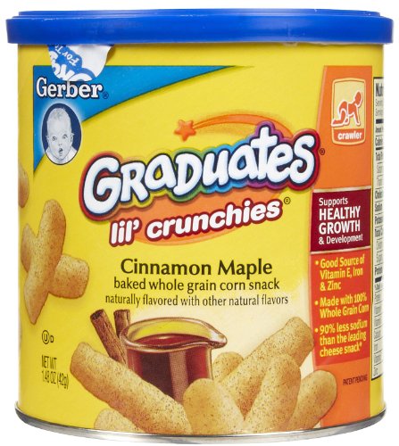 Gerber Graduates Lil' Crunchies -- Cinnamon Maple -- 1.48 oz. As your baby grows into toddlerhood, about 25% of his calories will come from snacks. Graduates Lil' Crunchies snacks are a great way to make every bite count because they are a good source of 3 vitamins and minerals, have whole grains and are designed just right for babies and toddlers. Graduates Lil' Crunchies are baked whole grain corn snacks that are naturally flavored with other natural flavors.